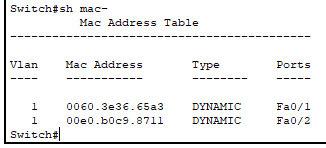 패킷 트레이서에서 스위치의 mac테이블을 확인해보면 mac 주소와 ports가 매핑된것을 확인할 수 있습니다.