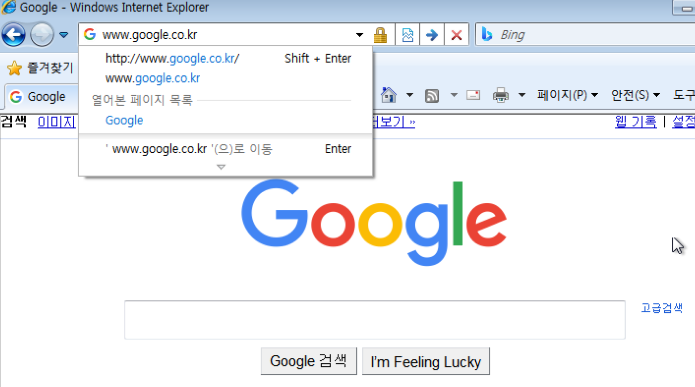 > 인터넷 익스플로러 주소창에 원하는 사이트 이름을 입력 후 키를 눌렀는데,