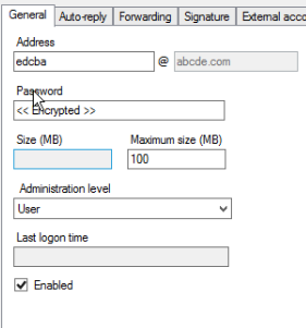 등록된 [Domains] 선택 => [Accounts] => <Add> 버튼으로 사용자 계정을 등록 및 사용 용량을 설정합니다.