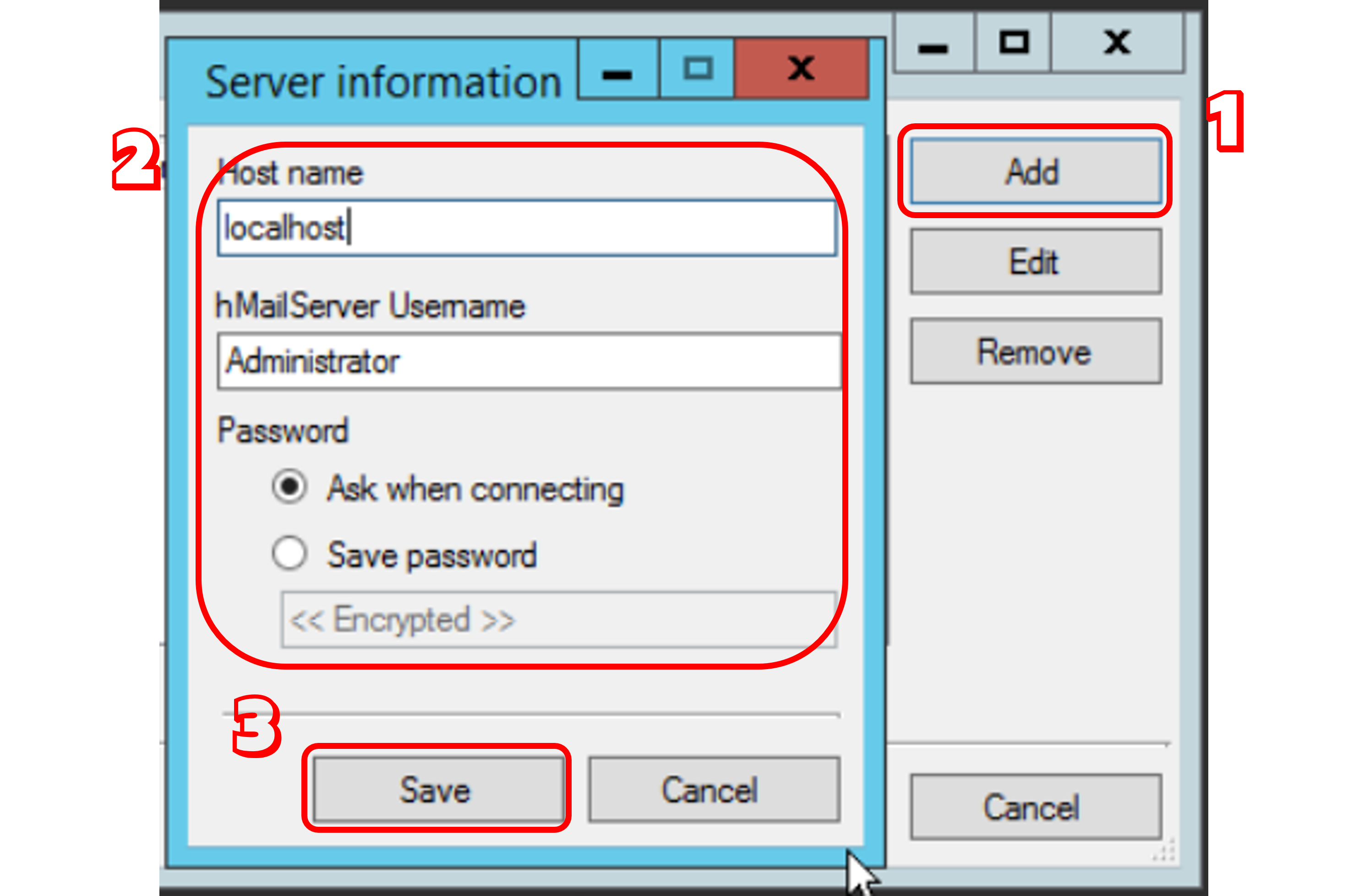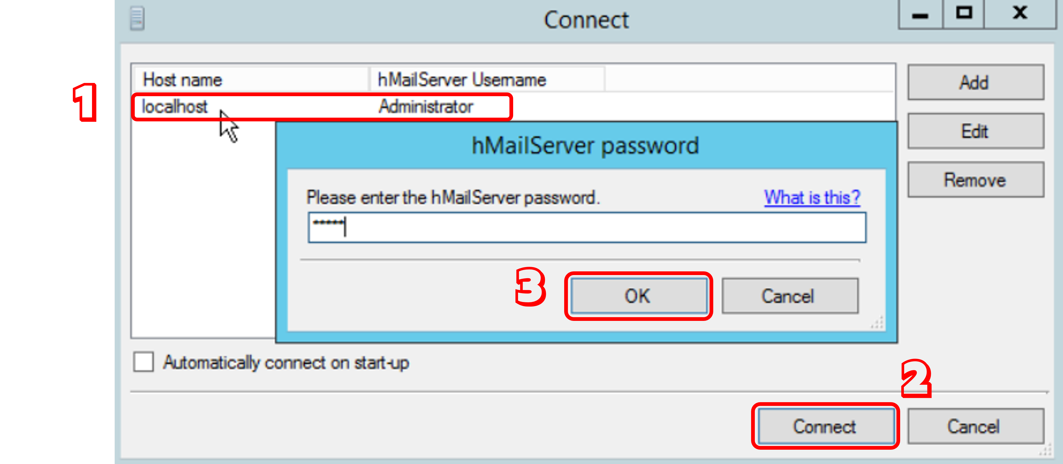 설치가 완료되면 hmailserver administrator를 실행하여 아래와 같이 메일 서버를 추가 후 연결합니다.
