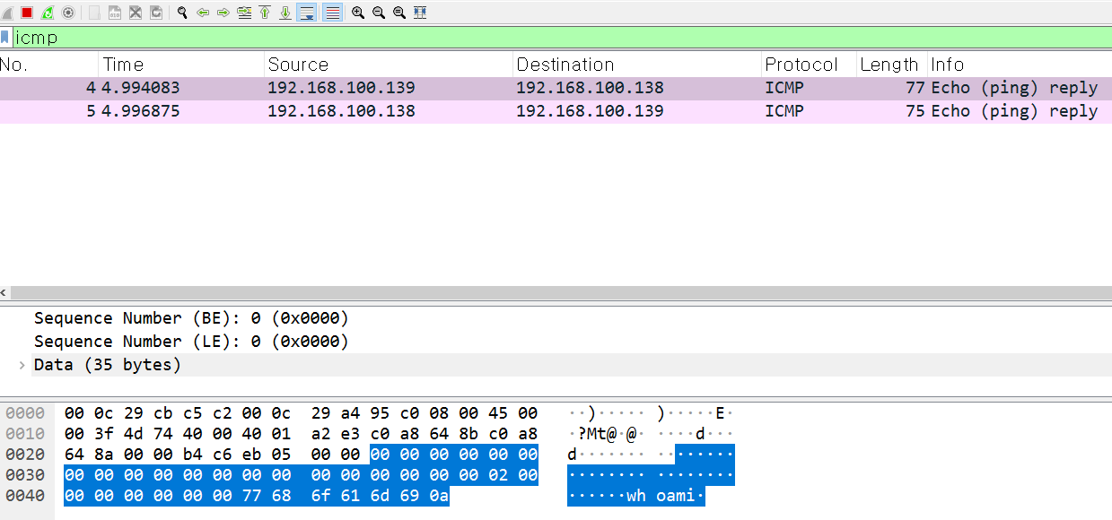 Wireshark에서 icmp 필터를 적용 후 명령어를 입력하여 icmp 패킷을 확인합니다.