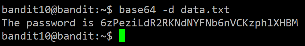 base64 -d 명령으로 data.txt를 디코딩하니, 비밀번호가 바로 확인됩니다.