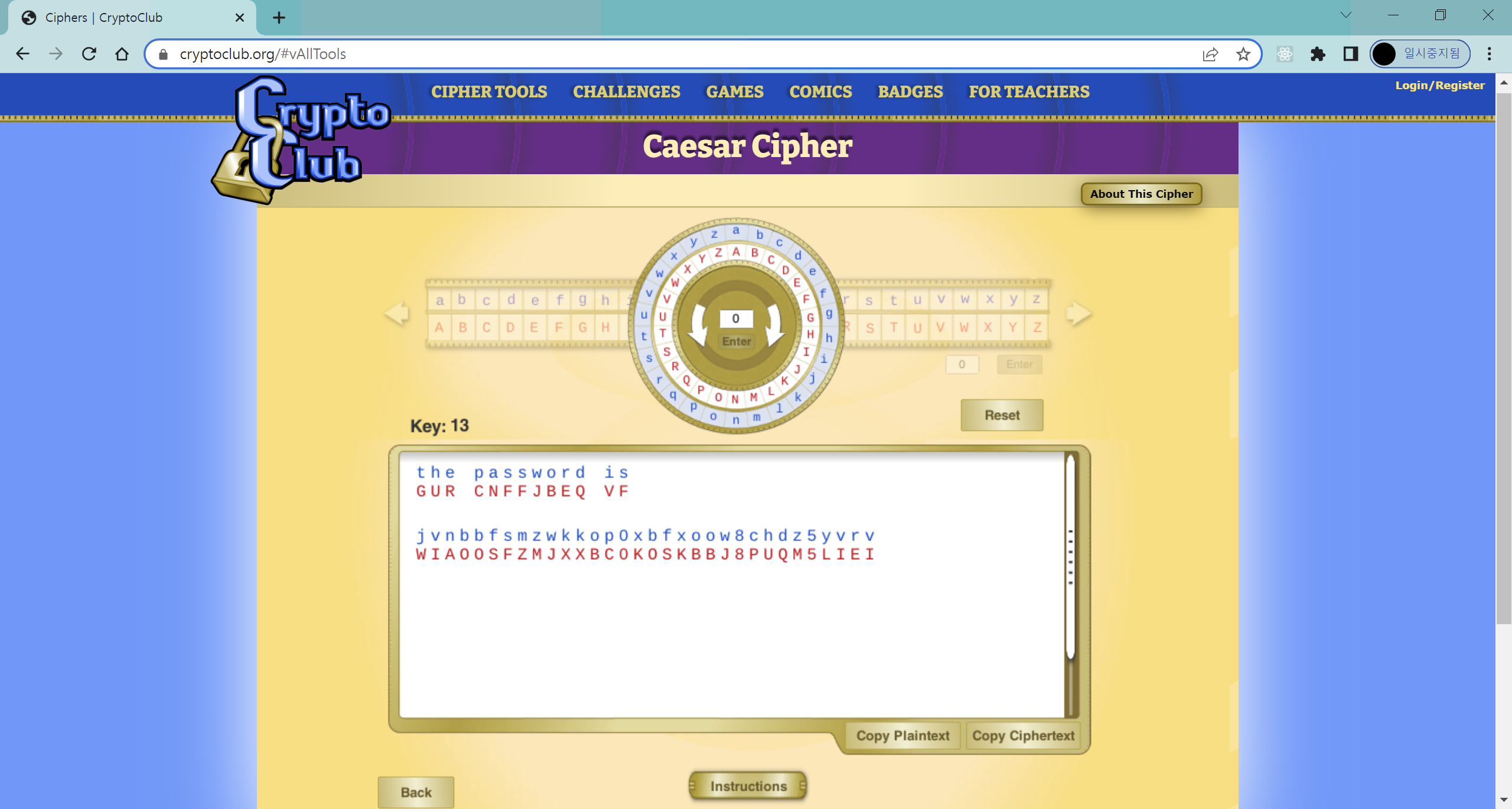lowercase(소문자, a-z)와 uppercase(대문자, A-Z)가 13 positions rotated 되었다고 쓰여있습니다.