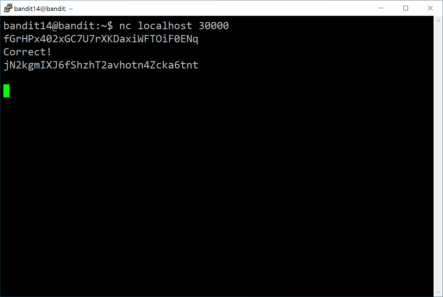 localhost의 30000번 포트에 bandit14 비밀번호를 제출하면 되므로, 아래와 같이 입력해야 합니다.