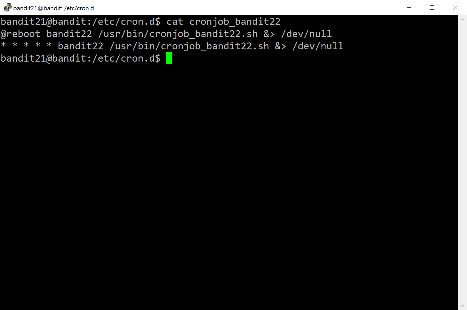 /usr/bin/cronjob_bandit22.sh 실행 시 표준 출력과 표준 에러를 모두 /dev/null로 버리는 것을 확인할 수 있습니다.