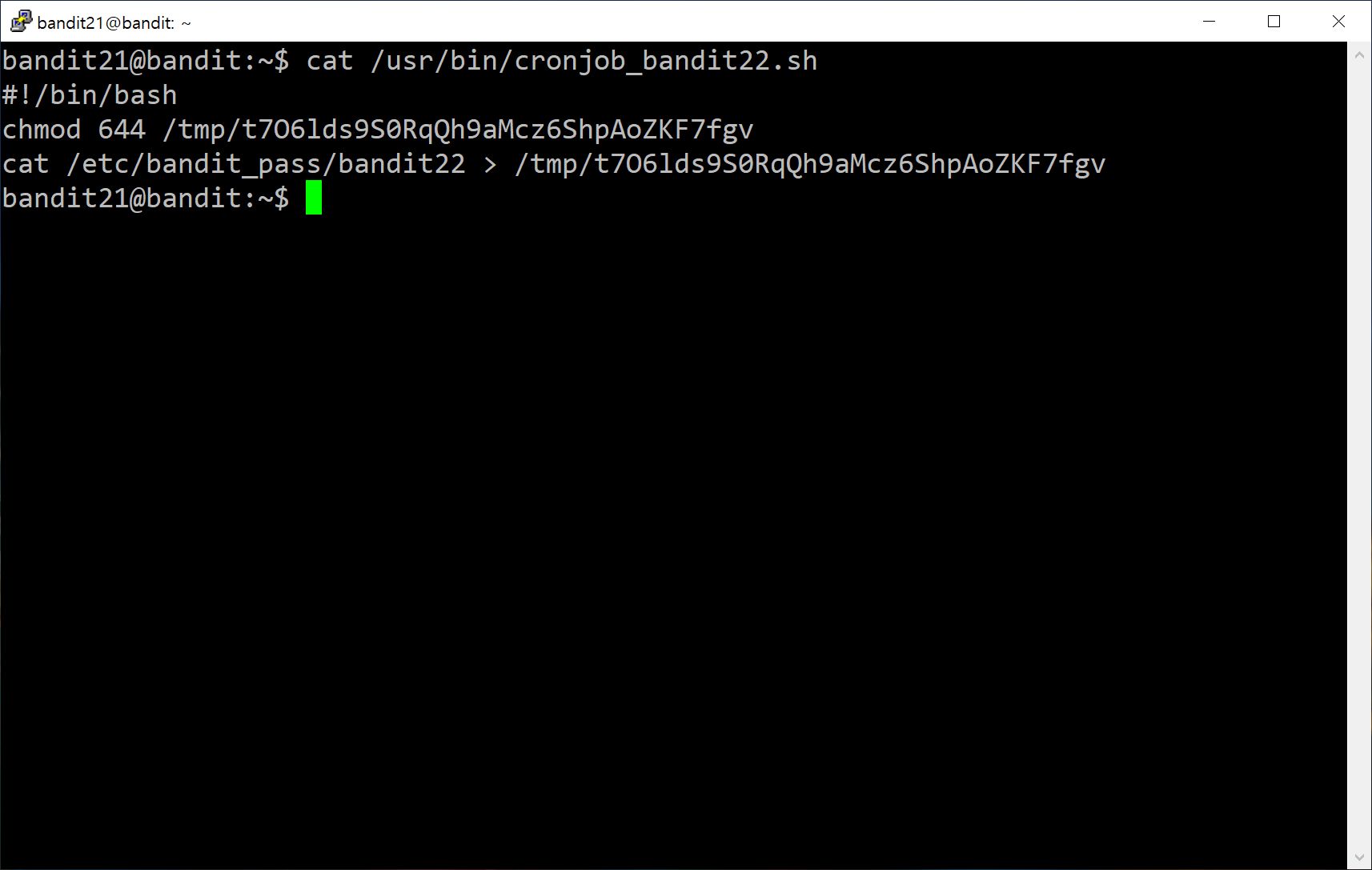 본론으로 돌아와서, cat 명령어로 /usr/bin/cronjob_bandit22.sh 파일에 대한 내용을 확인하겠습니다.