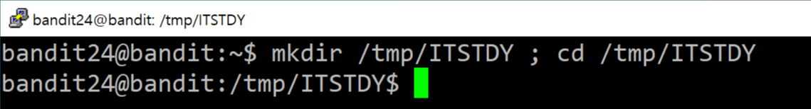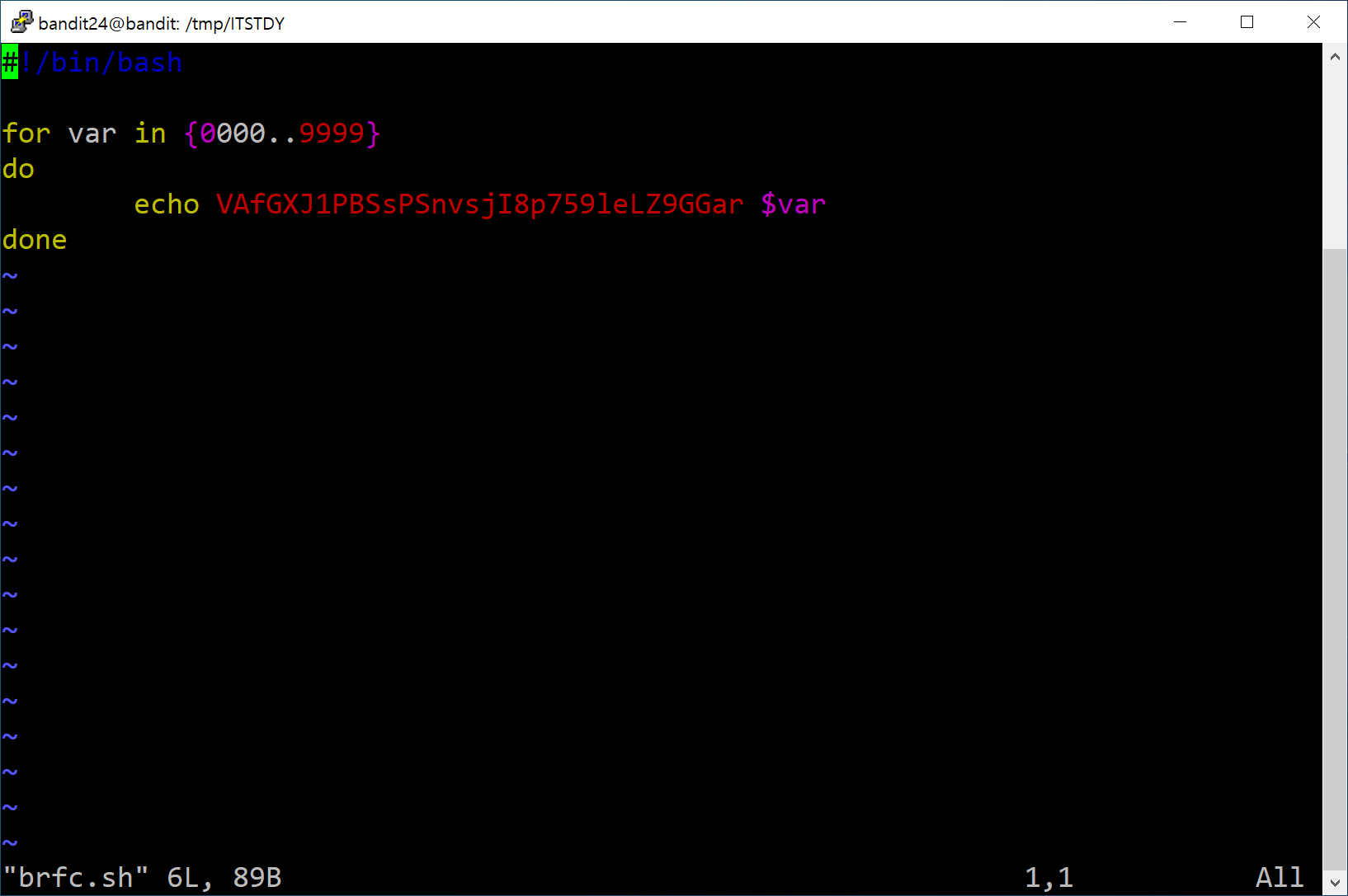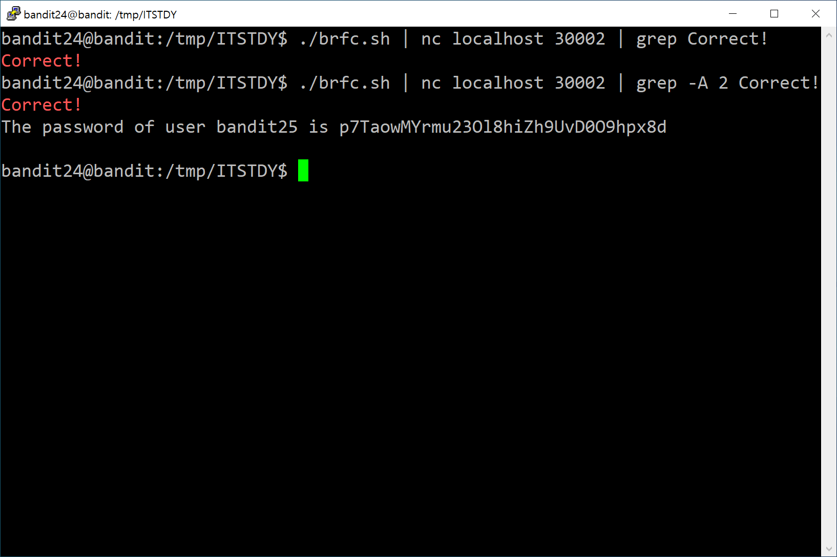 입력은 위와 같이 bandit24의 비밀번호와 4자리의 핀 번호를 개행이 아닌 공백으로 구분합니다.