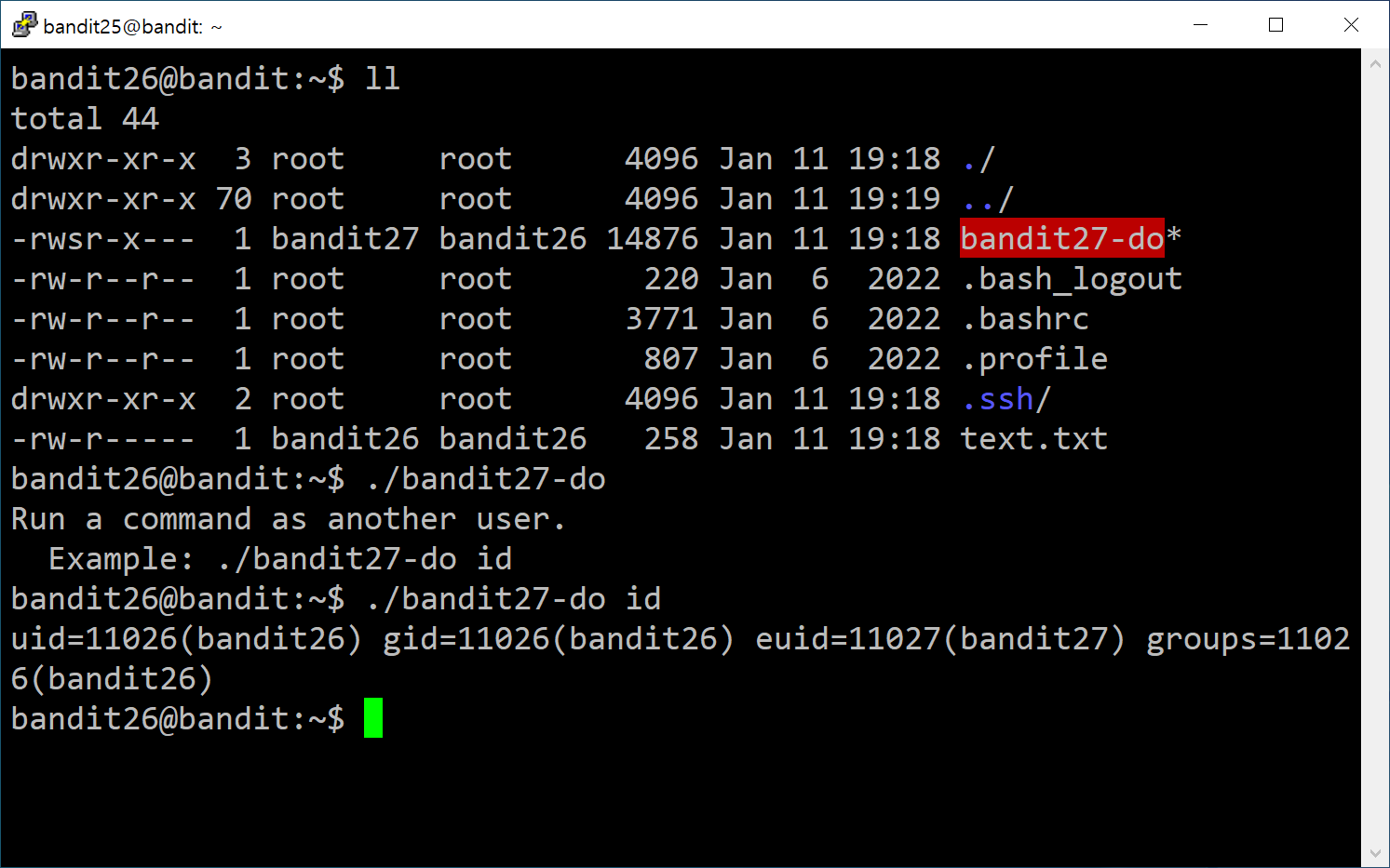 bandit26의 홈 디렉터리를 살펴보면 bandit27-do 파일이 있습니다.