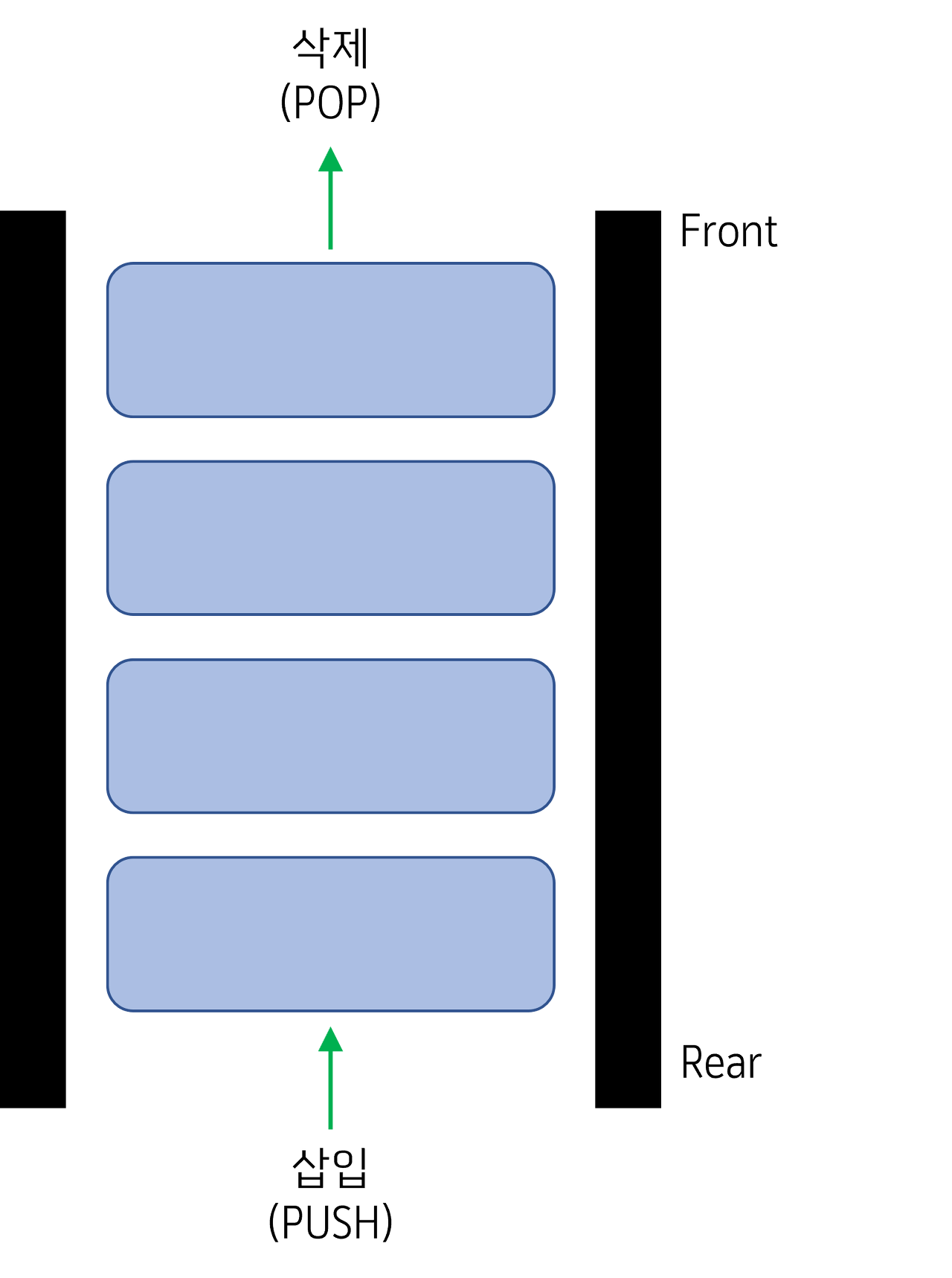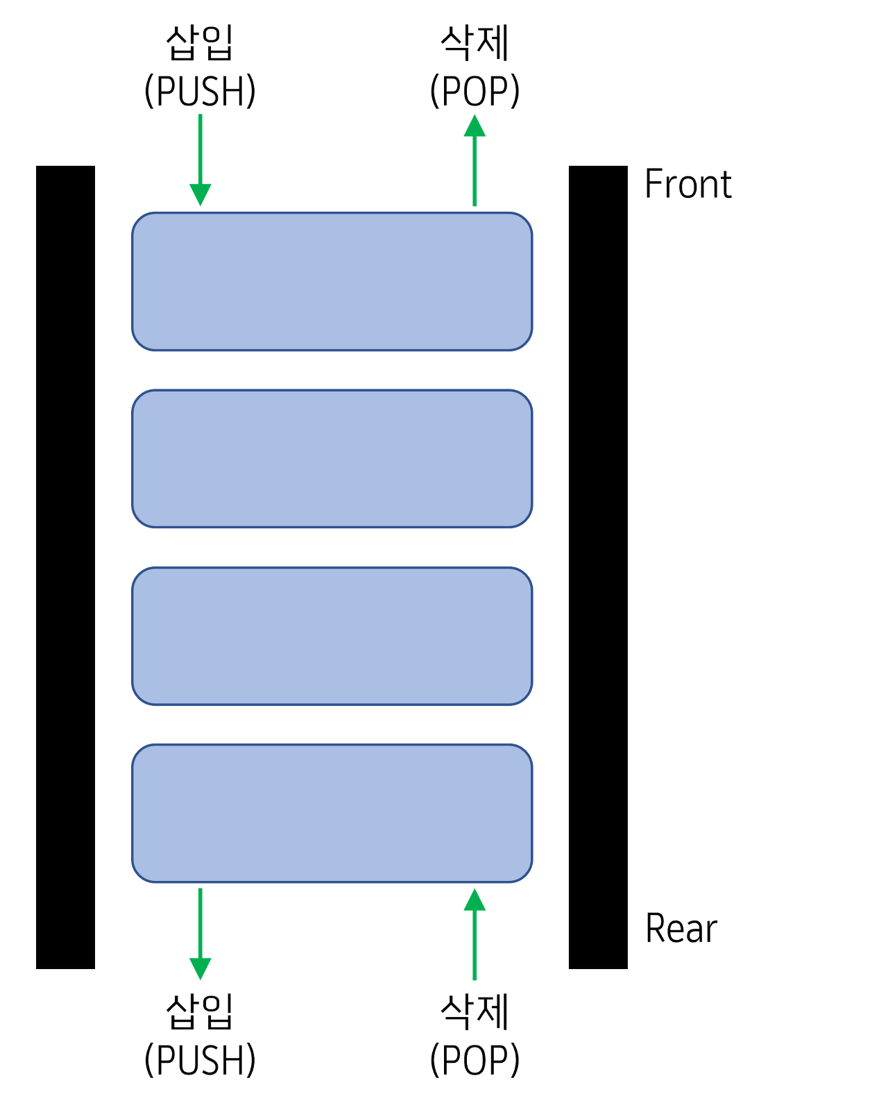 | ㉠ FIFO 방식으로 처리된다. ㉡ 순서 리스트의 뒤(Rear)에서 노드가 삽입되며, 앞(Front)에서 노드가 제거된다. ㉢ 선형 리스트의 양쪽 끝에서 삽입과 삭제가 모두 가능한 자료 구조이다. ㉣ 인터럽트 처리, 서브루틴 호출 작업 등에 응용된다. |