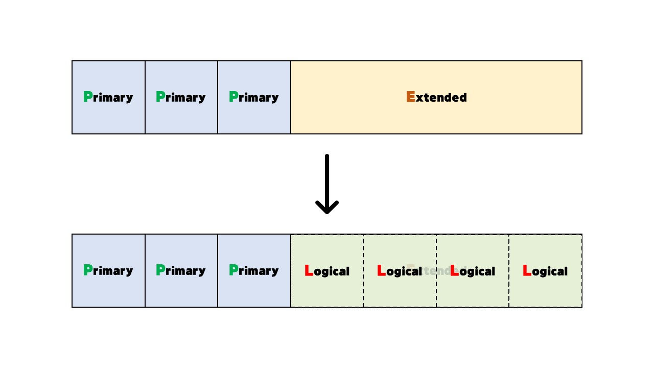 아래의 그림처럼 Primary는 세 개, Extended는 한 개를 생성한 후 Extended를 Logical 4개로 분할한다면