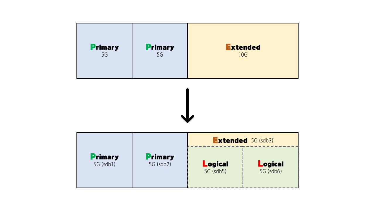7개로 분할한 sdb 디스크 전체를 그림으로 표현한다면 아래의 그림과 같습니다.