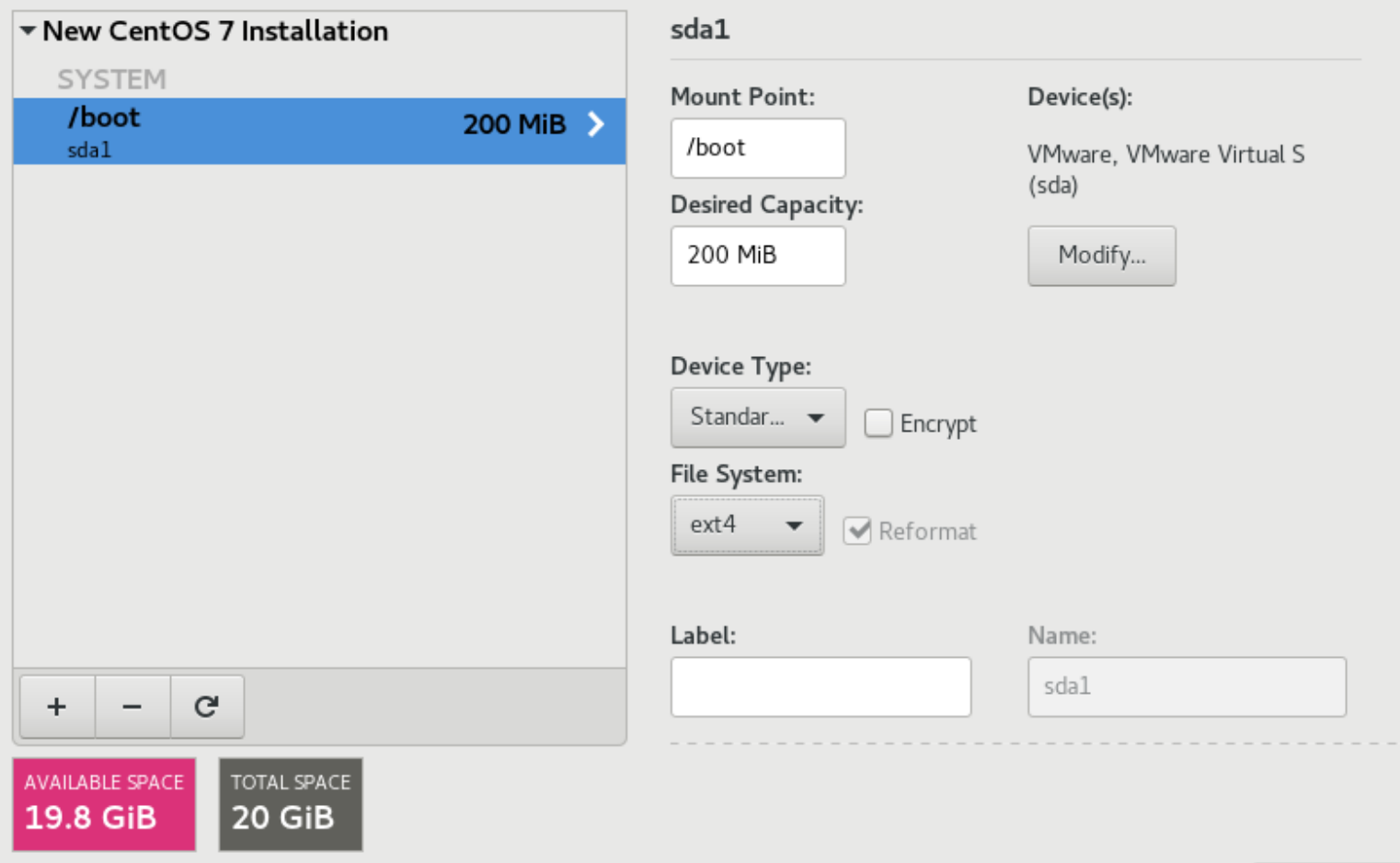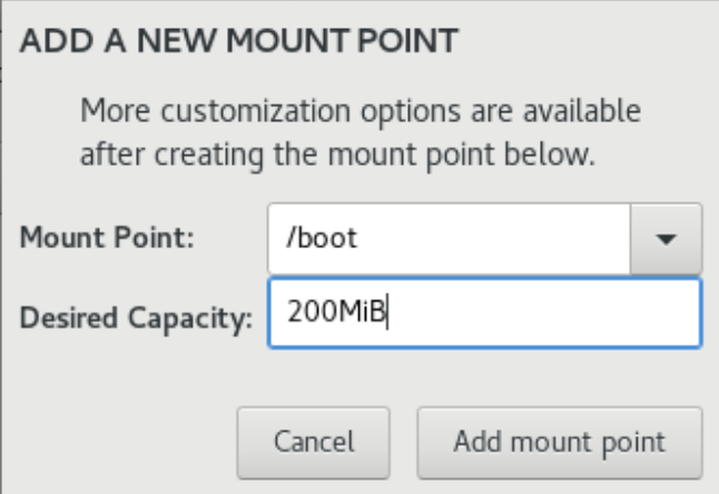 먼저 [ + ] 버튼을 눌러 /boot 에 200 MiB를 할당해줍시다.