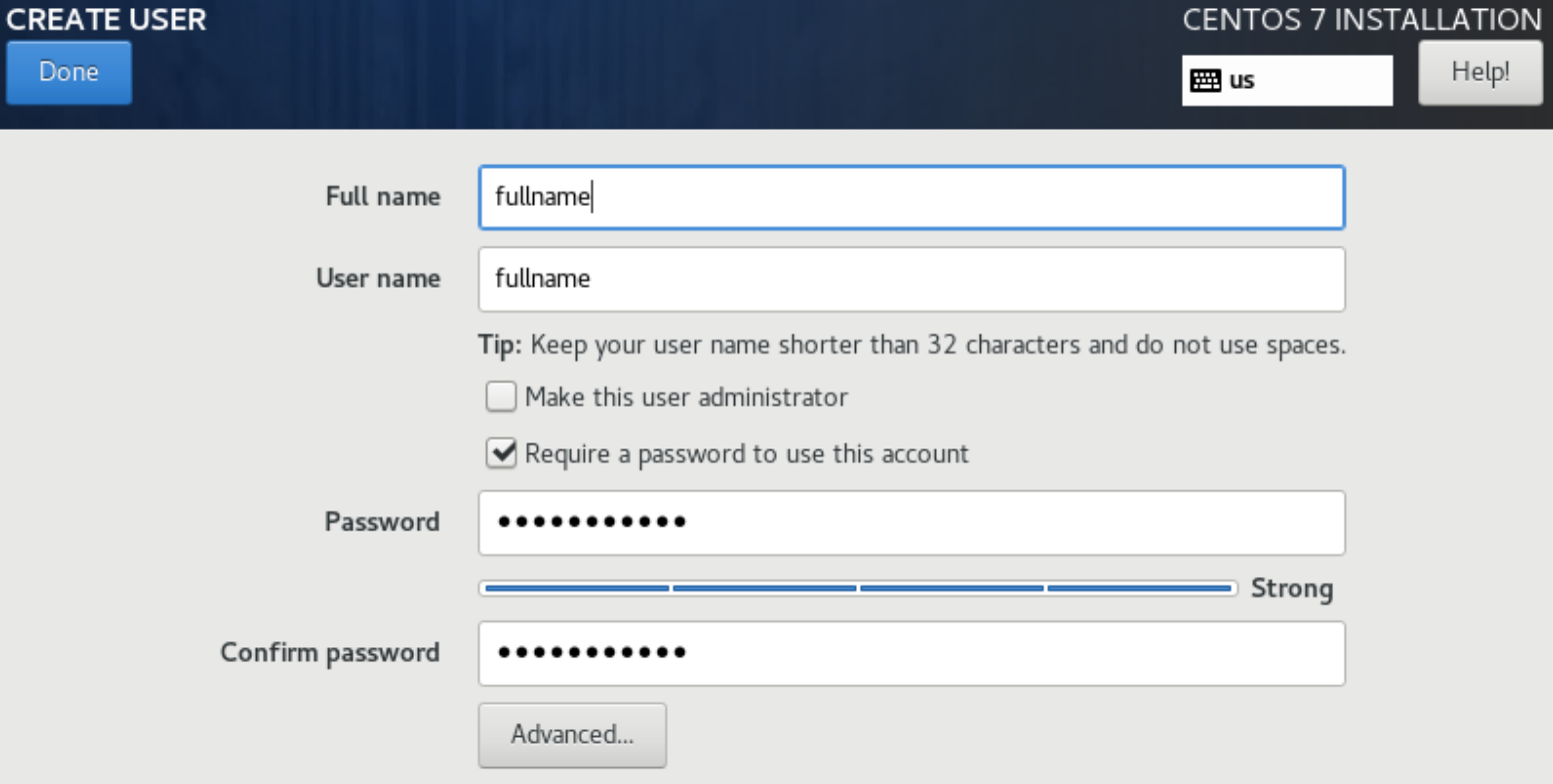 USER CREATION에서 계정 및 비밀번호를 입력하지 않거나 비밀번호의 강도가 약하면 설치 진행이 되지 않습니다.