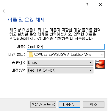 종류는 Linux, 버전은 Red Hat계열 64비트인 것을 확인한 후 다음으로 넘어가겠습니다.