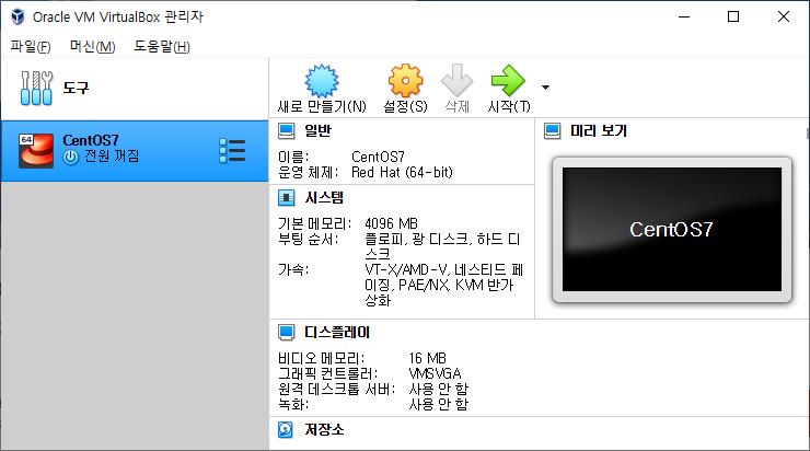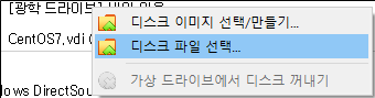 “[광학 드라이브] 비어 있음“을 클릭하여 ”디스크 파일 선택“을 클릭해서 CentOS-7-x86_64-DVD-2009.iso 파일을 연결한 후 화면 좌측의 가상 머신 CentOS7을 더블클릭하여 실행시켜줍니다.