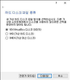 5. 하드 디스크 파일 종류 선택 창에서는 VDI를 선택 후 다음으로 넘어가겠습니다.