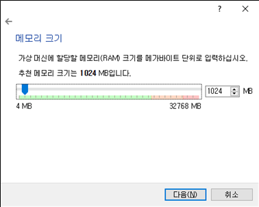 3. 메모리 크기를 설정하는 창이 나옵니다. 추천 메모리 크기는 1024MB(1GB) 이지만, 때에 따라서 원활한 구동이 어려울 수 있기 때문에 저는 4096MB(4GB)로 설정한 후 다음으로 넘어가겠습니다.