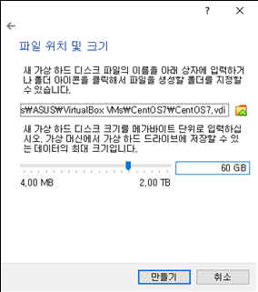 7. 동적 할당을 선택했기 때문에 60GB로 설정하더라도 실제 사용하는 용량만큼만 차지하기 때문에 저는 60GB로 설정한 후 만들겠습니다.