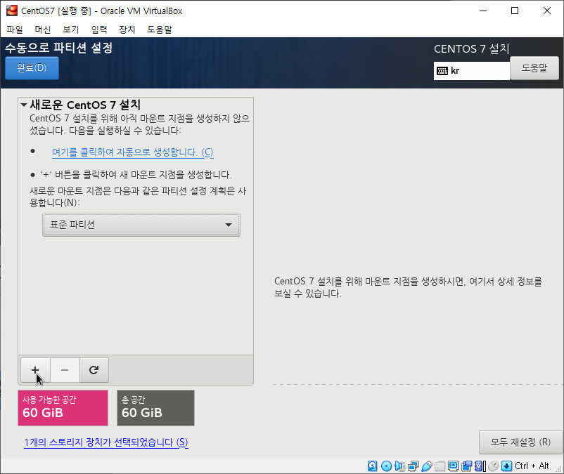 4. 표준 파티션을 선택 후 [ + ]를 클릭하여 마운트 지점을 생성해주도록 하겠습니다.
