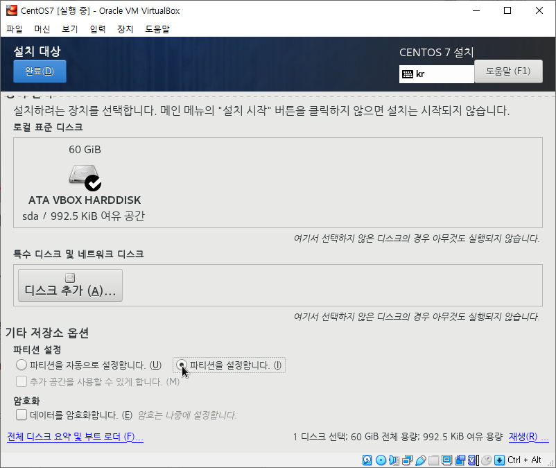 “파티션을 설정합니다” 선택 후 완료를 클릭합니다.