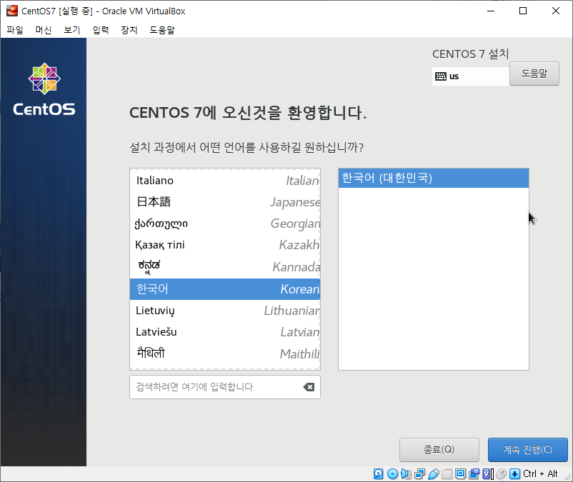 1. 가상 머신을 실행하면 처음으로 언어 설정 창이 나옵니다. 영어로 설정하게 되면 설치 이후 한글 언어 팩이 설치되지 않기 때문에 한국어를 체크 후 계속 진행하도록 하겠습니다.