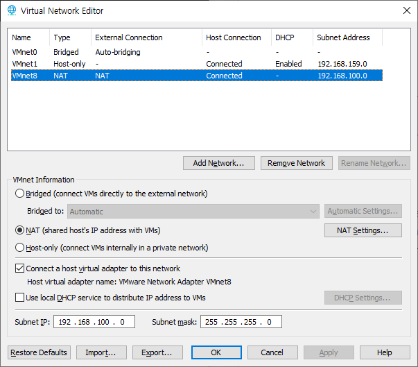 VMnet8을 클릭 후 Subnet IP는 192.168.100.0으로, Subnet mask는 255.255.255.0으로 설정해주고