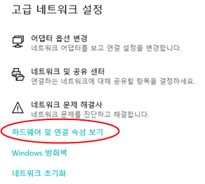 물론 cmd창에서만 확인할 수 있는 것은 아닙니다. 네트워크 상태 - 하드웨어 및 연결 속성 보기에서 확인 가능합니다.