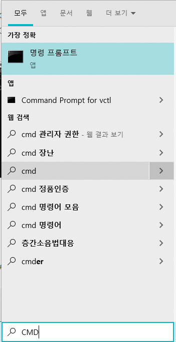 좌측 하단 검색창에 CMD 또는 명령 프롬프트를 검색하시면 CMD가 나옵니다.