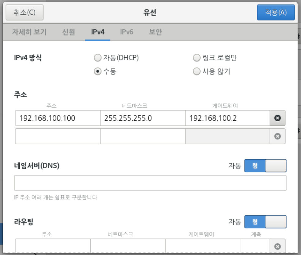 192.168.100.100 / 255.255.255.0 / 192.168.100.2로 설정해줍니다.