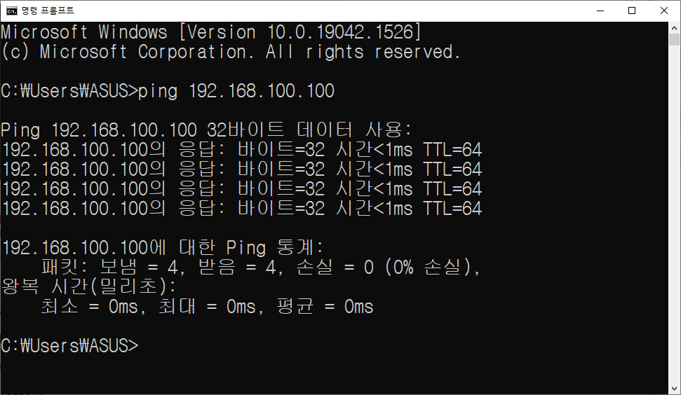cmd 창에서 ping 192.168.100.100 입력 후 엔터