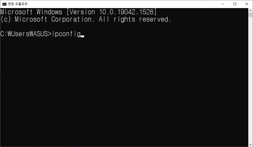 클릭해서 CMD 창을 켜주신 후 ipconfig를 입력하고 엔터 눌러주시면 Window IP 구성이 나옵니다.