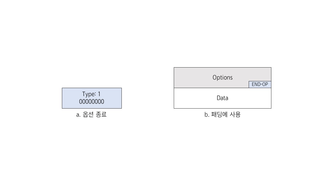 - 옵션 필드의 경계를 맞추기 위해 1바이트 이상이 필요하다면 무연산 옵션이 사용된 후 마지막에 옵션 종료 옵션이 사용됨.