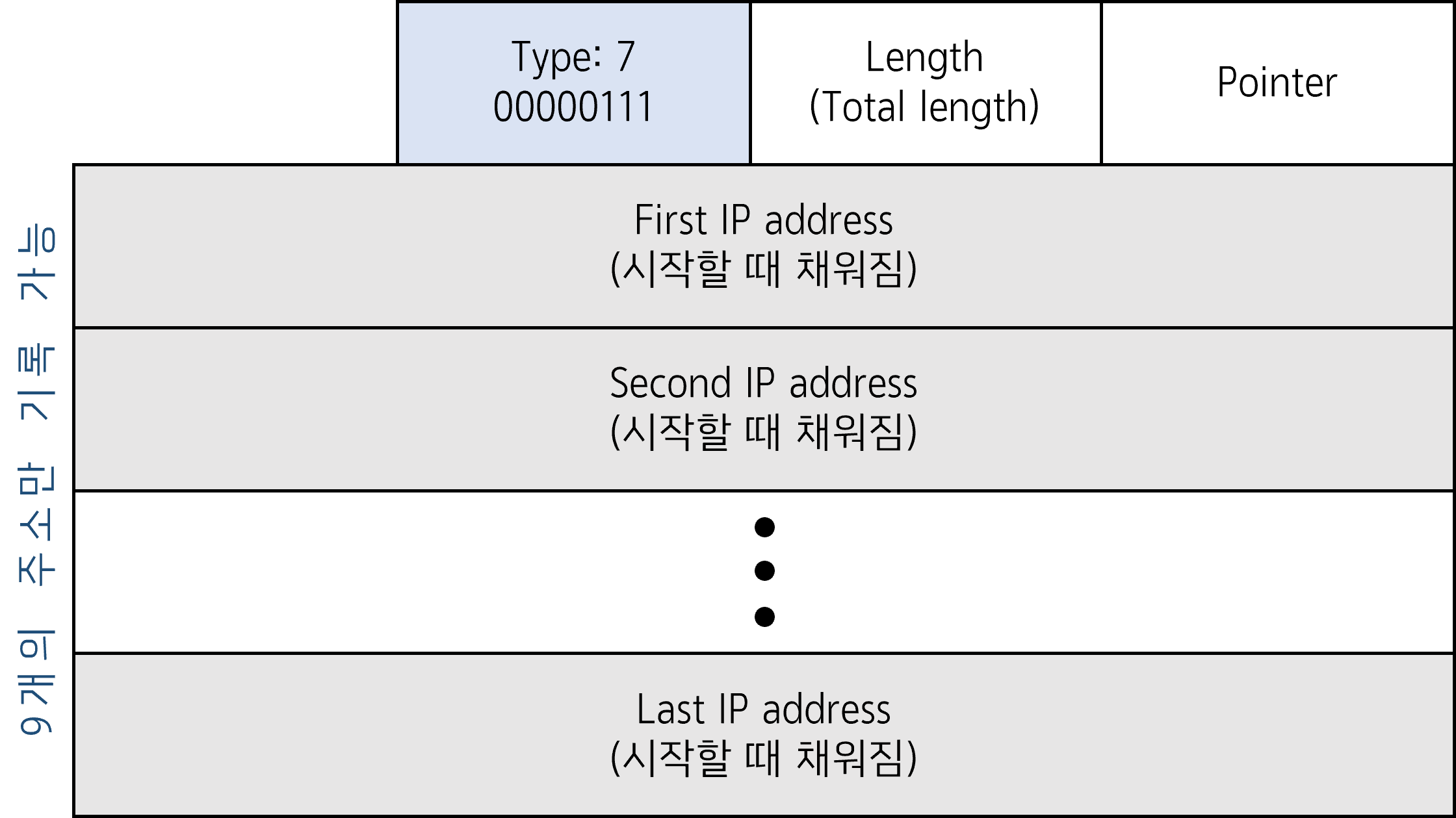 - 헤더 최대 길이가 60바이트이고, 이 중 20바이트는 기본헤더이므로 최대 9개의 IP주소까지 기록할 수 있음.