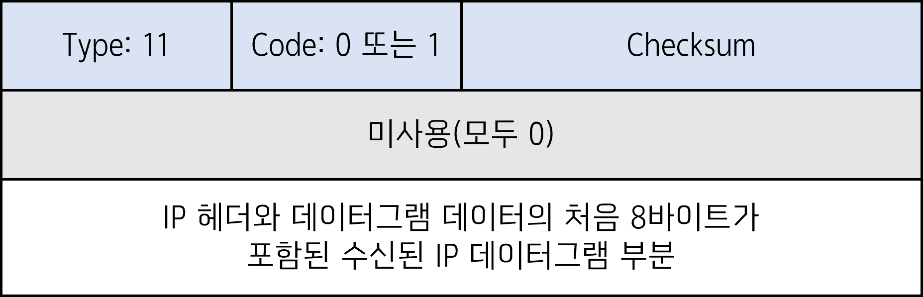 - 라우터는 TTL 값이 0인 데이터그램을 받을 때마다 데이터그램을 폐기하고 원래의 발신지에게 시간-경과 메시지를 전송