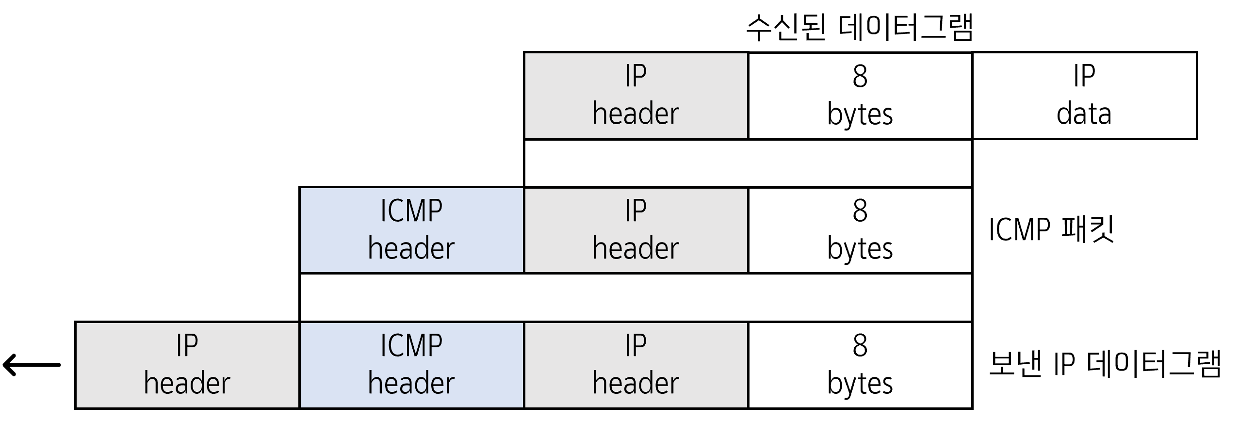 - 모든 오류 메시지의 데이터부분에는 데이터그램의 IP 헤더와 데이터그램의 데이터 중 처음 8바이트가 포함되어 있음.((오류 메시지를 전달할 때 모든 데이터를 보내는 게 아니라, 데이터의 가장 앞 8바이트만 붙여서 보내는 것.))