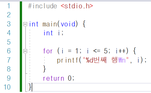i가 5일 때 조건값인 i <= 5가 참이기 때문에 printf("%d번째 행\n", i); 문장이 실행됩니다.
