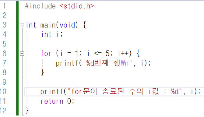 문장 실행 후 i값은 증감값인 i++에 의해 1이 증가되어 6이 되었지만, 조건값에 거짓이므로 for문을 종료하게 됩니다.