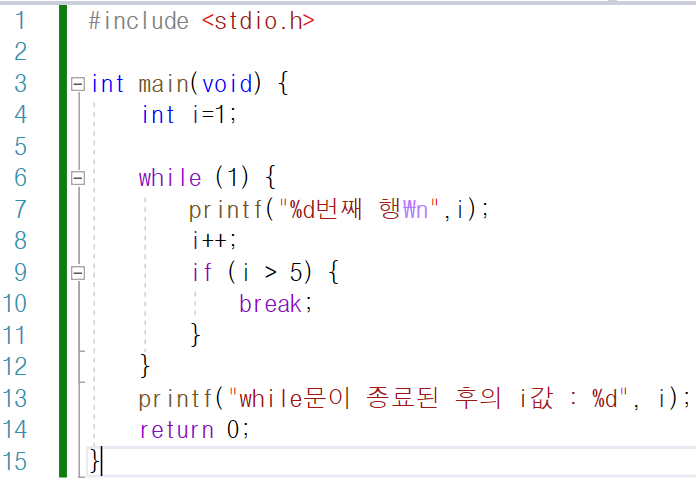 위 예문의 조건식인 i <= 5 대신 1과 if문을 사용하여 아래와 같이 코드를 구성할 수 있습니다.