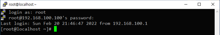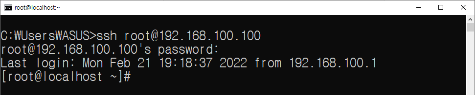 ssh root@192.168.100.100을 입력하고 엔터, 비밀번호 입력 후 엔터 눌러주시면 putty와 똑같이 접속이 된 것을 확인할 수 있습니다.