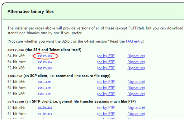 제일 위에 있는 64-bit x86: 버전의 putty.exe 클릭해서 다운로드 해줍니다.