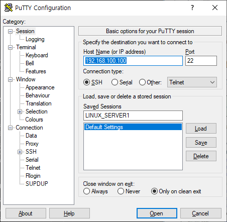 Host Name (or IP address)에는 192.168.100.100을 입력해줍니다.