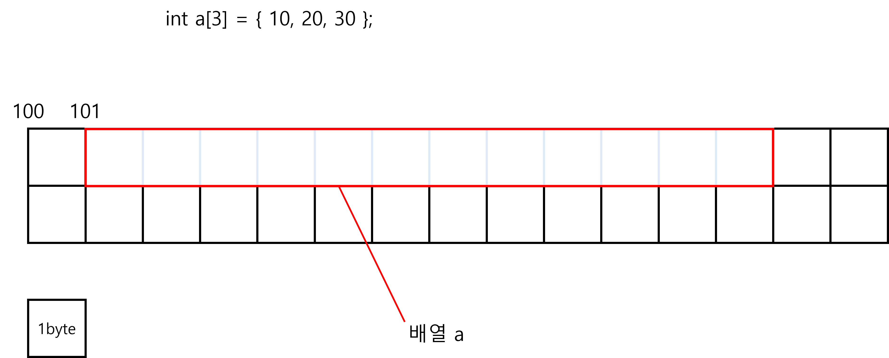 int형은 4byte이고, 배열의 크기는 3이기 때문에 배열 a는 메모리 주소 101번부터 12개의 방을 차지합니다.