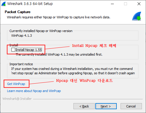 Npcap 대신 WinPcap으로 설치하겠습니다.