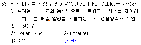 FDDI (Fiber Distributed Data Interface) : 100Mbps의 전송 대역폭을 지원하는 프로토콜. 기본 전송 매체가 광섬유이며, 토큰링의 접근 방식과 유사. (네트워크 액세스를 제어하기 위해 토큰 패싱 사용) |
