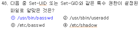 SetUID가 설정된 파일을 실행할 경우 일시적으로 파일 소유자의 권한을 얻게 됨. (root 권한을 직접적으로 부여한다면 보안에 취약하기 때문에 SetUID 등의 특수 권한 사용) 일반 사용자도 passwd 명령어를 실행하여 패스워드를 변경해야 하기 때문에 /usr/bin/passwd(passwd 명령어 실행 파일)은 SetUID 권한을 가짐. |