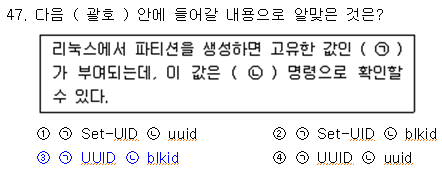 Set-UID : 특수 권한 (4000) UUID : 고유한 일련 번호 부여 blkid : 디스크의 위치나 타입을 확인하는 명령어 |