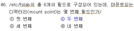 < /etc/fstab의 필드 > [ 파일시스템 장치 ]/[ 마운트 포인트 ]/[ 파일시스템 종류 ]/[ 옵션 ]/[ 덤프 ]/[ 파일점검 옵션 ] 따라서 마운트 포인트(두 번째) 필드이다. |