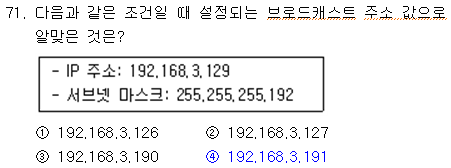 IP주소의 129와 서브넷 마스크의 192를 AND 연산하여 나온 값에 해당하는 클래스 최대값을 구함. 10000001 && 11000000 == 10000000(128) 128은 "B Class" , B Class의 최댓값은 191. 즉 다음 조건의 브로드 캐스트 주소값은 192.168.3.191이다. |