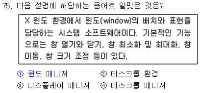 설명에 해당하는 용어는 "윈도 매니저". 윈도 매니저는 X-윈도우상에서 윈도우의 배치와 표현을 담당함. |