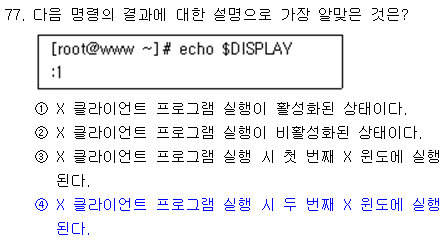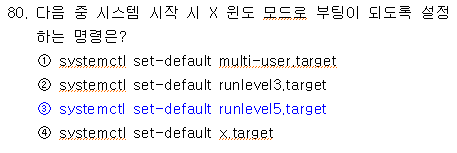 runlevel에 관해 묻는 문제. 0 : 시스템 종료 1 : 싱글 모드(관리 모드) 2 : 멀티 유저 실행 모드 (NFS 지원 X) 3 : 멀티 유저 실행 모드 (NFS 지원 O) 4 : unused. 5 : 멀티 유저 실행 모드 (X윈도우 환경) 6 : 재부팅 |